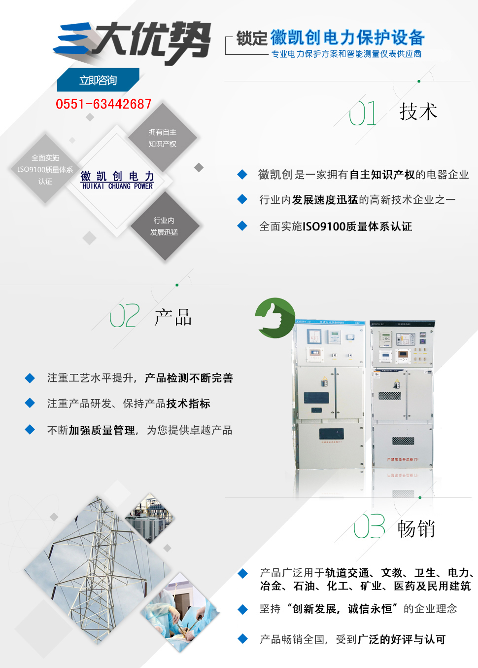 安徽徽凱創(chuàng)電力保護(hù)設(shè)備有限公司主要從事新型電氣設(shè)備、電子設(shè)備、智能控制技術(shù)的產(chǎn)品研發(fā)、生產(chǎn)、銷(xiāo)售。主要產(chǎn)品有:智能型消弧消諧裝置、消諧過(guò)電壓抑制柜、 組合式過(guò)電壓保護(hù)、智能型開(kāi)關(guān)柜智能操控裝置、微機(jī)消諧、小電流選線(xiàn)、電弧光保護(hù)裝置、智能在線(xiàn)絕緣監(jiān)測(cè)裝置等電氣產(chǎn)品。 產(chǎn)品廣泛用于石化、煤炭、電力、建筑、市政、機(jī)場(chǎng)、鐵路、醫(yī)院、學(xué)校等領(lǐng)域,受到用戶(hù)一致好評(píng)。
